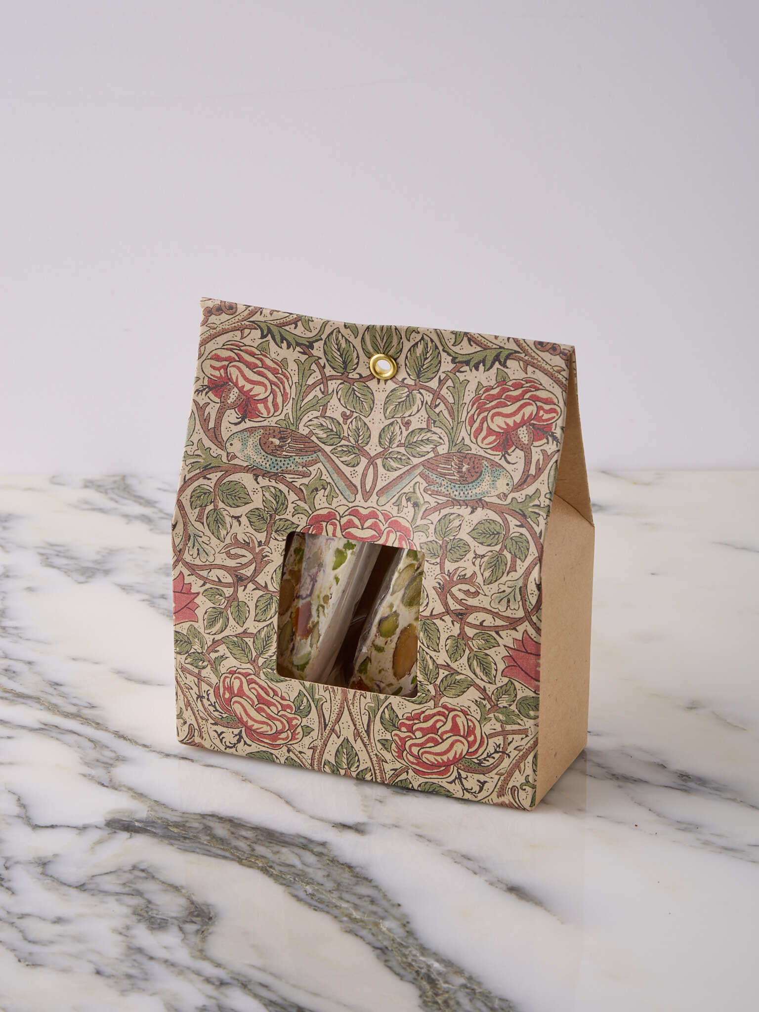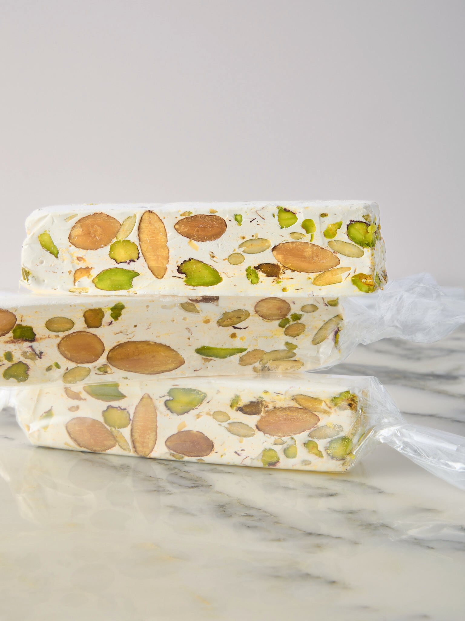 イタリアのシチリア、ブロンテ村のピスタチオをふんだんに使ったヌガーは、白に緑のピスタチオが目をひきます。